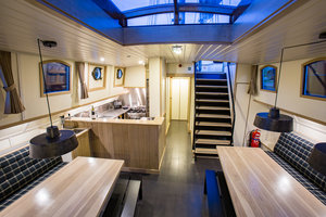 Insgesamt können 16 Gäste (bei Übernachtung) an Bord des Plattbodenschiffes kommen. Beim Umbau des Schiffes wird vor allem auf Komfort geachtet. Das Interieur des Schiffes aus Ulmenholz ist hell und strahlt viel Wärme aus. Außer dem gemütlichen Tagesraum gibt es eine halboffene Küche. Diese Küche ist komplett ausgestattet und verfügt unter anderem über einen Gastronomieofen, eine Mikrowelle und eine professionelle Spülmaschine. Des Weiteren gibt es eine kleine Bar mit Zapfanlage.